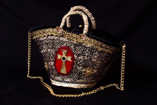 Nella seconda facciata spicca una croce in ottone sbalzato a mano su velluto e pizzo nero. Sulla base dei manici applicazione in ottone sbalzato a mano impreziositi da bigiotteria rossa.